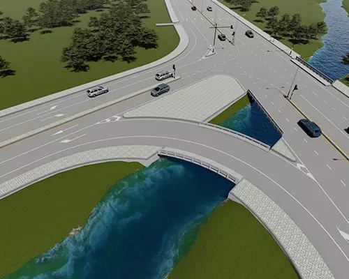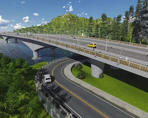 Supervise the construction of a 0.28 m. thick reinforced concrete road with 6-8 traffic lanes and the construction of a large bridge across 3 intersections and 1 railway crossing, along with the construction of a drainage system, the installation of lighting systems, signs and traffic markings, along with safety equipment, for a total distance of 10.570 kilometers.