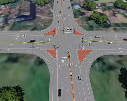 Construction of a 0.10 meter thick asphalt concrete road, a 4-lane road, each lane 3.50 meters wide, dividing traffic directions with a concrete wall-type island 3.20 meters wide, with shoulders 3.00 meters wide. In the community area there is a sidewalk 3.40 meters wide