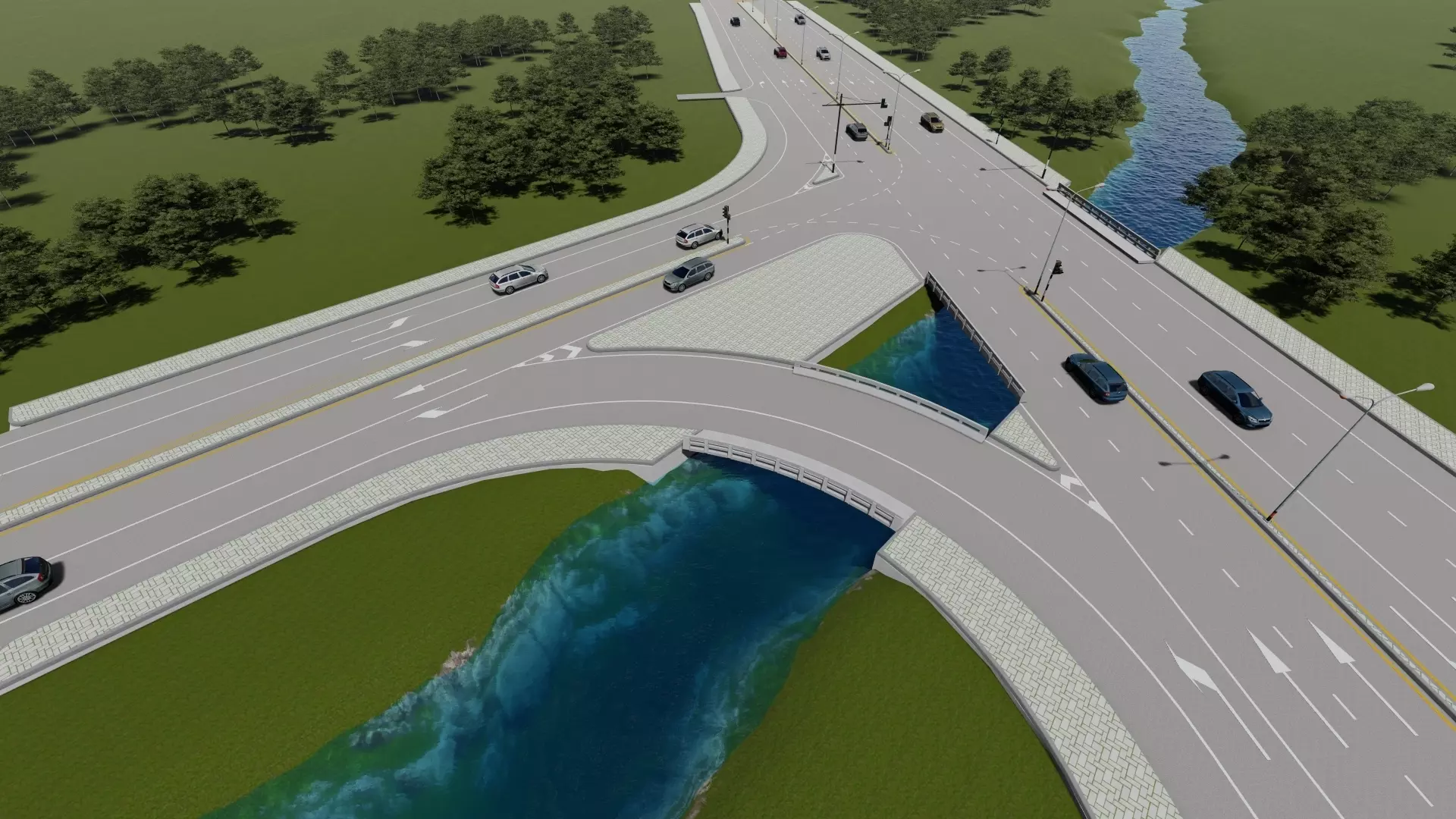Controlling the construction of a 6-lane asphalt concrete road, a parallel reinforced concrete bridge over an intersection, totaling 4 lanes, 10.50 meters wide on each side, 382.00 meters long.
